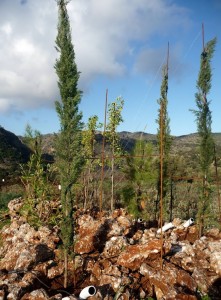 When the weather has allowed, we’ve been busy in the garden. We’ve planted 3m cypresses, pine trees and ficus in an embankment of rocks at the North edge of the plot which we had constructed. We’ve had to make up our own soil – adding peat, sand & fertilizer, as the native stuff is so full of clay its almost impossible to work. And each tree has to be staked and secured with stays in three directions to stop the winds blowing them over. Every morning when we wake up we check to make sure they haven’t been blown over during the night!